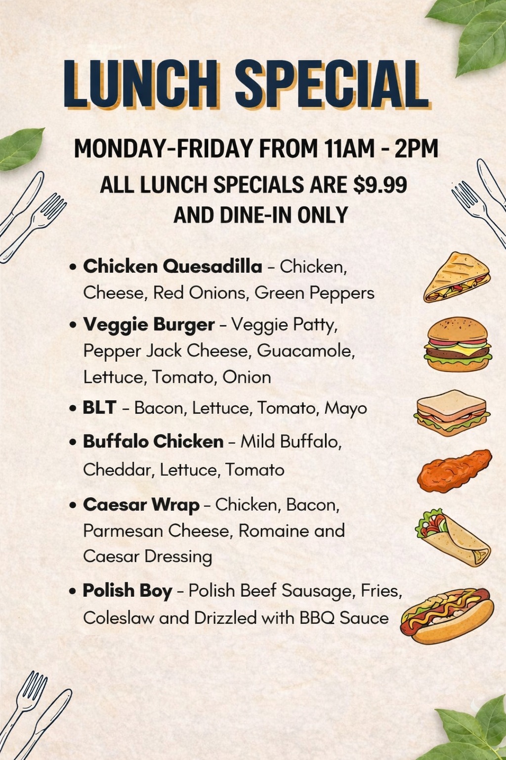 From juicy burgers and wings to hearty mains and shareable bar bites, our menu brings all-American classics with a twist. Whether you're here for game day, date night, or just a damn good meal, we've got something for every appetite.